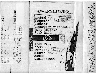 In this particular case I'm not entirely sure whether Haverslizurd is the name of the band or the title of the album, but in any case we can rectify that in a later stage (check the cover). Apparently this was an obscure American band from the late 80's that hailed from Richmond, Virginia. Probably Carrier Communications was their own cassette label, but I can't find any information on it.